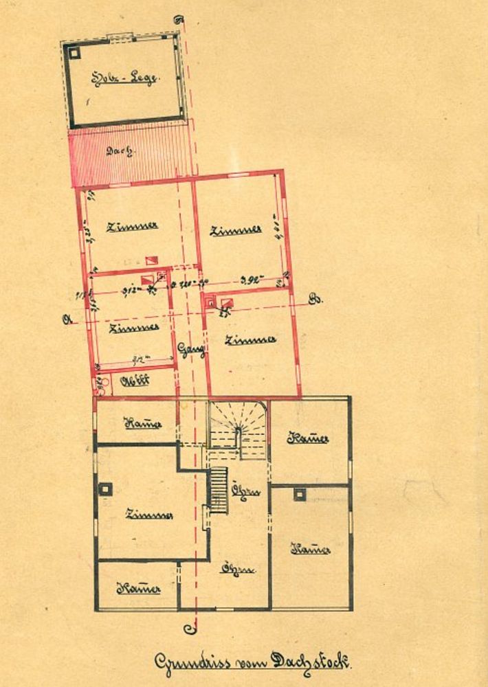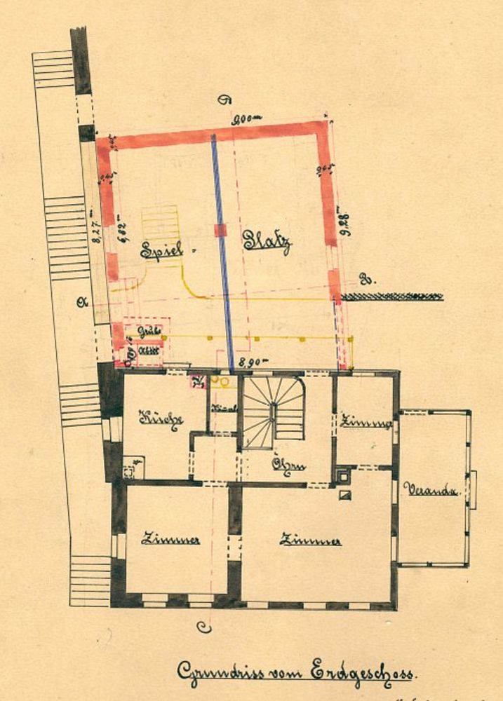 1900: Zwecks Einrichtung eines Mädchenpensionats lässt Pauline Klein einen 9 m breiten und (max.) 9,20 m langen, dreistöckigen Anbau an das Haus erstellen. Im Erdgeschoss befindet sich ein "Spiel-Platz", im Ersten Stock ein Saal und im Dachstock vier Zimmer.