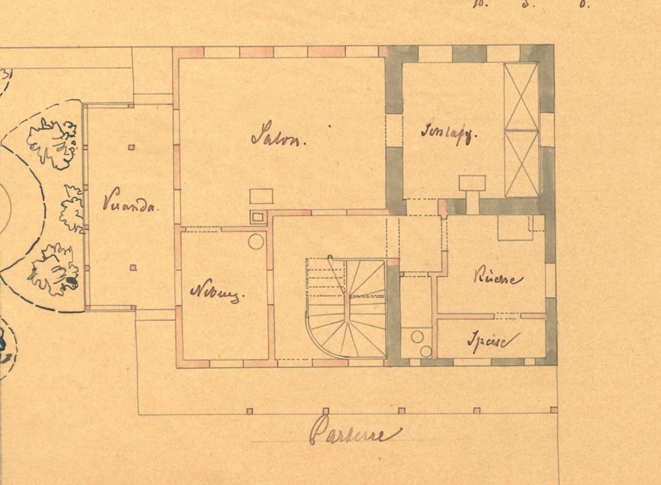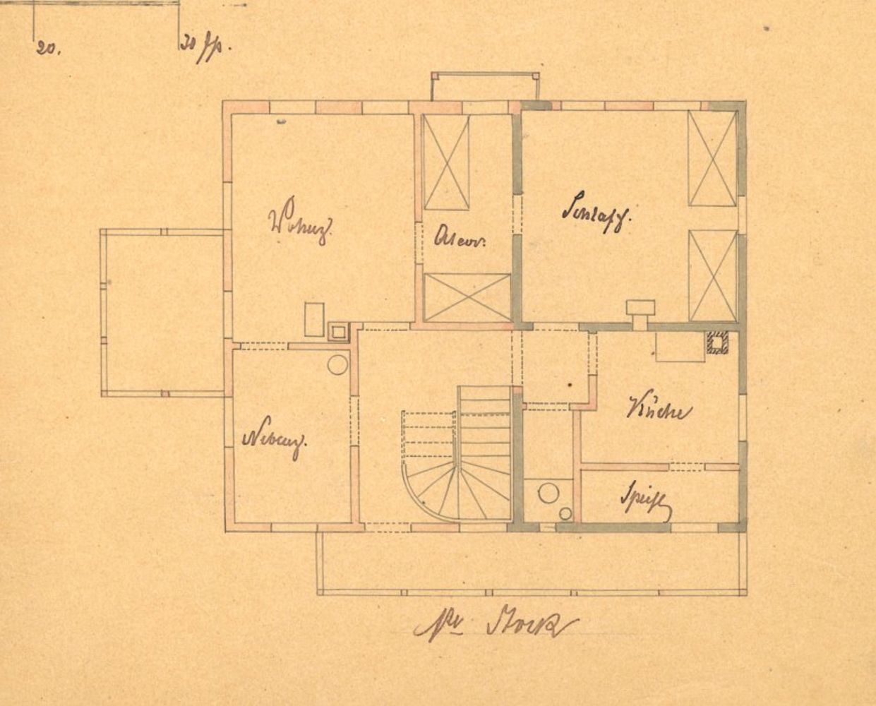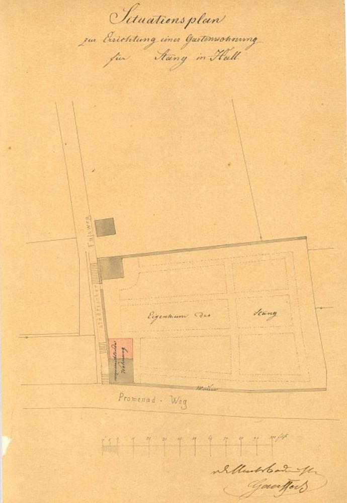 1864: Bahnmeister Heinrich Stang lässt in seinem Gartengrundstück (dem früheren Deeg'schen Garten) das untere der beiden dort befindlichen Gartenhäuser vergrößern. Hierbei wird die Grundfläche des Hauses in etwa verdoppelt, ein neuer erster Stock aufgesetzt und ein Ofen eingebaut.