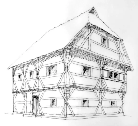 Zweigeschossiges Wohnhaus mit trapezartigem Grundriss, dendrochronologisch ins Jahr 1410/ 11 datiert. Rückwärtig zur Straße gelegener Flachkeller mit 4 qm, über eine Falltür (Holzstiege) erschlossen. Kellermauerwerke ebenfalls aus dem 15. Jh., wohl zeitgleich mit Gebäude entstanden. Vgl. Datenbank Bauforschung Baden-Württemberg.