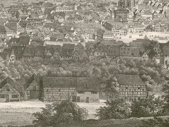 1662 (Verkauf an David Müller): "ihre halbe und obere Behaußung jenseit Kochers an der Stattmauer bey den Hirttenheußern, daran edelbesagter H. Müller das undere Theil hiebevor keufflichen an sich gebracht" (4/656, Bl. 195v-196r).