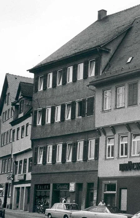 Dachwerk dendrochronologisch in das Jahr 1469/70 datiert. Zwei wohl zeitgleich entstandene Gewölbekeller enthalten ältere Mauerwerke aus dem 13./14. Jh. Die östliche Stirnwand repräsentiert wahrscheinlich ehem. Kocherufermauer (vor Anlage der Mauerstraße im 15. Jh.) mit 170 cm Dicke. "Unruhiger " Wandverlauf wird auf Hochwasserschäden zurückgeführt. Kappengewölbe des 2. Kellers aus dem 19. Jh. (vgl. Datenbank Bauforschung Baden-Württemberg).