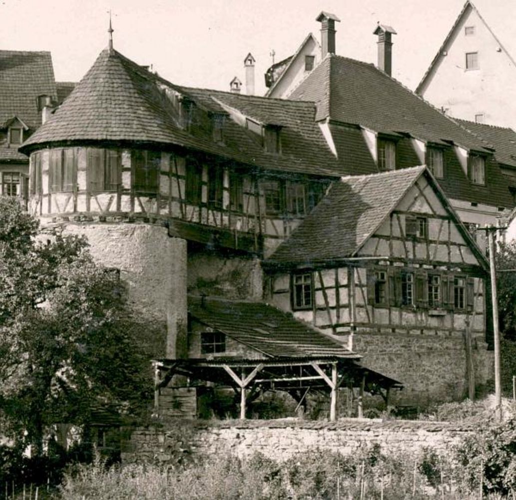 Weilertor 6: Stadtmauer mit Gerberturm (Nr. 6, § 28). Stadtbefestigung, 14. Jahrhundert, Fachwerkaufstockung, 1799 (d).(siehe auch unter Sachgesamtheit Stadtbefestigung "Am Markt 14, ...") (aus: Liste der Kulturdenkmale in Baden-Württemberg, Stadt Schwäbisch Hall, Stand 13.11.2013)