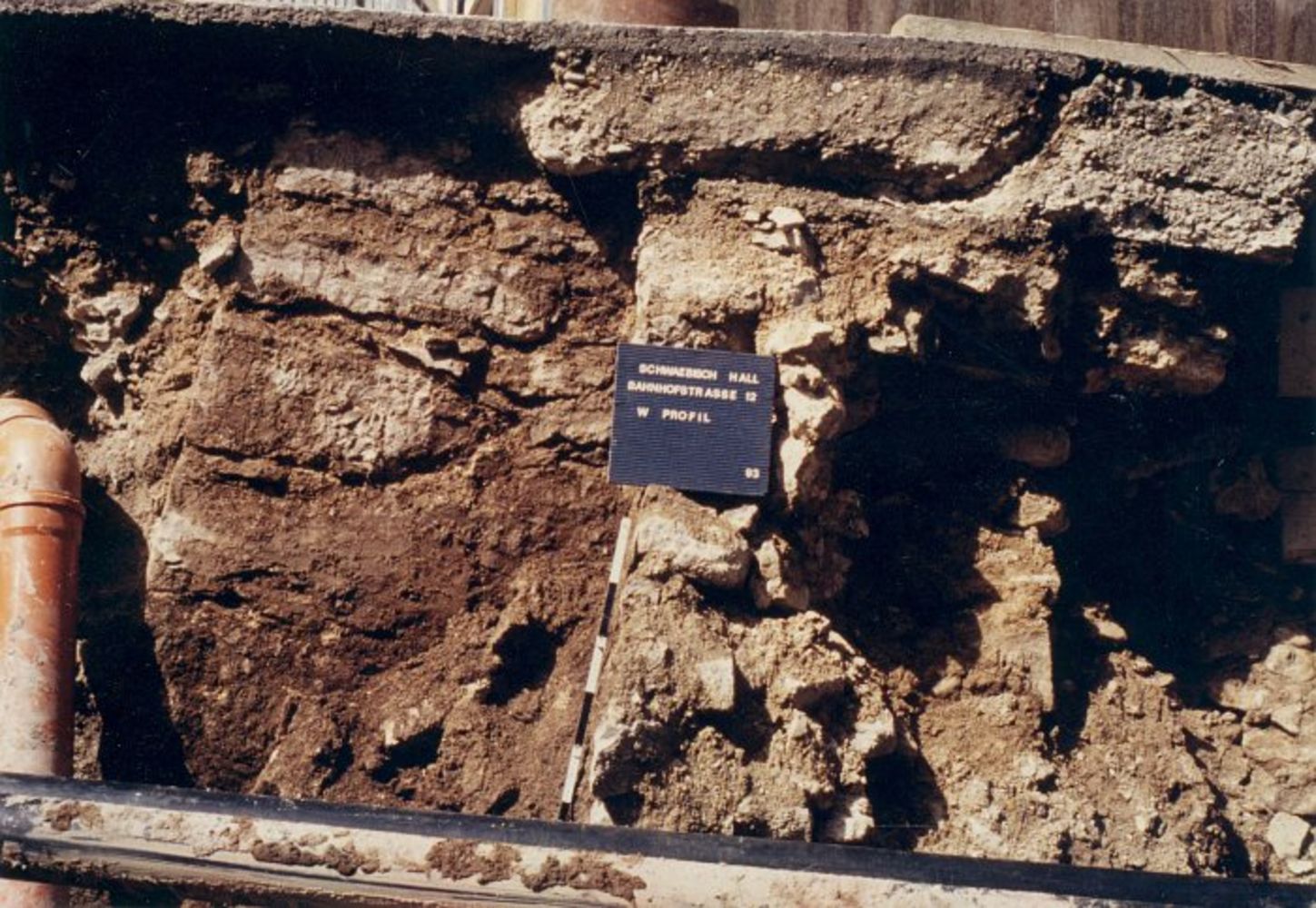 Bei der Neuverlegung städtischer Versorgungsleitungen fanden sich im September 1993 im Straßenraum vor dem Gebäude Bahnhofstraße 12 mehrere querende Mauerzüge. Vor der südöstlichen Hausecke zur Bahnhofstraße hin befindet sich ein aus grob behauenen Kalksteinquadern errichteter Eckverband, bei dem es sich um die südliche Außenwand des Riedener Tores handelt. Teile des Mauerwerks wurden in die Kelleranlagen der Gebäude Bahnhofstraße 12 und 15 einbezogen. (StadtA Schwäb. Hall S26/241, vgl. auch<link https: www.bauforschung-bw.de objekt mauerwerksbefunde schwaebisch_hall bahnhofstrasse mauerwerksbefunde.html blank> Datenbank Bauforschung Baden-Württemberg).