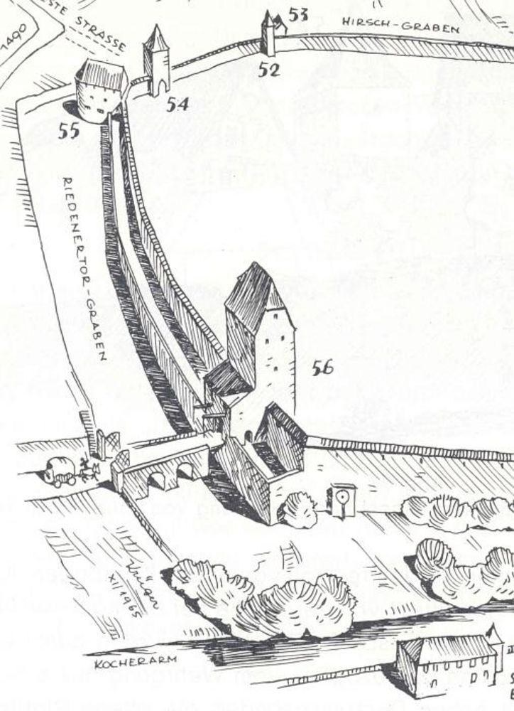 Das Riedener Tor wurde 1490 gebaut und ersetzte das ältere, nordwestlich des Pulverturms gelegene Lullentor als Zugang zur Katharinenvorstadt (siehe Rekonstruktionszeichnung von E. Krüger unter "Bilder"). Seinen Namen hatte es von dem Weg, der aus dem Tor in Richtung Rieden führte. Es handelte sich den vorhandenen Darstellungen zufolge um einen hohen, rechteckigen Steinbau mit einem Krüppelwalmdach. Wie die Zeichnung von P. Koch zeigt, bestand die Stadtseite des Turms aus Fachwerk. Vorgebaut war ein in den Zwinger gesetztes, überdachtes Vortor. Von hier aus führte eine Steinbrücke über den etwa 5 m tiefen Riedenertorgraben. Auf der Stadtseite wurde die Brücke durch eine Zugbrücke, auf der anderen Seite durch ein weiteres, kleines Vortor gesichert. Direkt neben dem Tor bildete die Stadtmauer eine Ecke, von der aus sie schräg in Richtung Kocher und Rotstegturm verlief. Im Zusammenhang mit Jagdstreitigkeiten überrumpelte 1690 Graf Ludwig Gottfried von Hohenlohe-Pfedelbach die Torwache und drang in die Stadt ein, zog sich aber schnell zurück, um nicht in Gefangenschaft zu geraten. Der Riedenertorgraben diente 1704 als Kriegsgefangenenlager für knapp 600 Franzosen, Savoyer und Piemontesen, die Prinz Eugen von Savoyen nach seinem Sieg in der Schlacht bei Höchstädt an der Donau nach Hall gebracht hatte. Das Tor wurde 1824 abgebrochen, an seine Stelle das "Stuttgarter Tor" (siehe Rekonstruktion von E. Krüger unter "Bilder") gesetzt, das aus zwei Pylonen und einem Wachhaus (heute Bahnhofstraße 12) bestand.Den sich anschließenden Riedenertorgraben schüttete die Gemeinde erst 1872 zu und legte ihn als Stadtgarten an. Das Torwächterhaus diente bis 1880 zur Einziehung der städtischen Torgefälle (= Zoll), nach deren Aufhebung wurde es als entbehrlich angesehen und in Privathand verkauft.