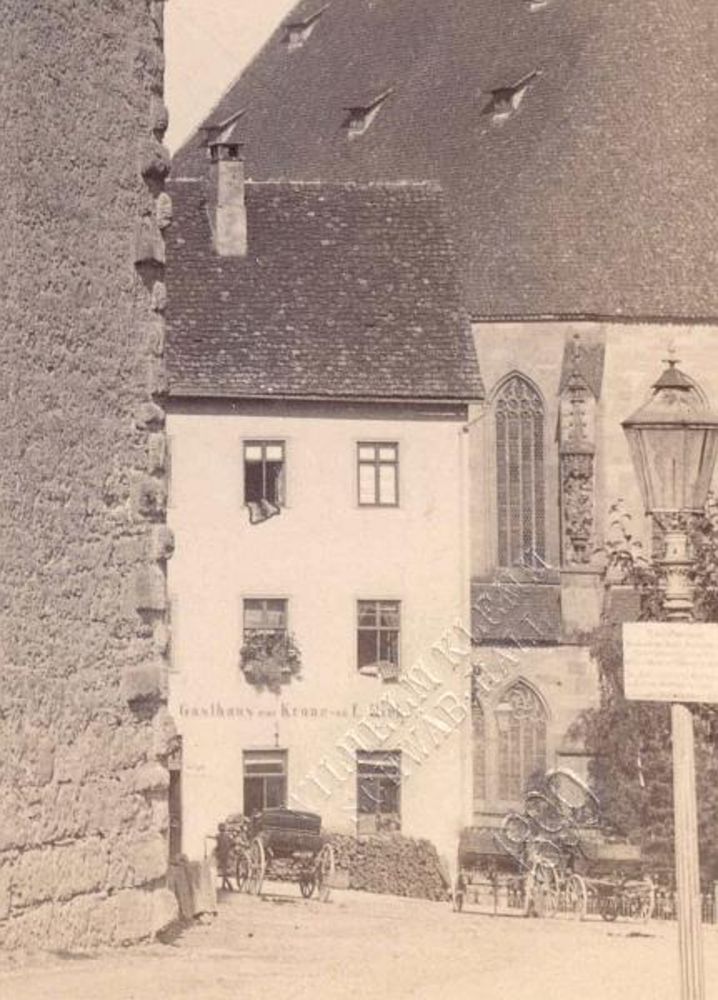 Die alte Gastwirtschaft "Krone" befand sich im Nebenhaus Klosterstraße 2. Erst als 1878 der Besitzer beider Häuser Otto Flumm das Haus Klosterstraße 1 an Joseph Berroth verkaufte, wurde de Wirtschaftsgerechtigkeit übertragen (StadtA Schwäb. Hall 19/842, S. 981)