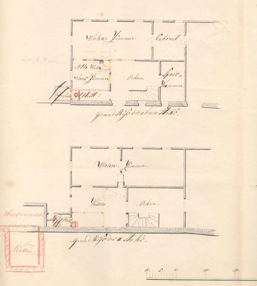 1827: Wohnhaus mit 11,3 und Waschhausanbau mit 3,4 Ruten, insgesamt 14,7 Ruten Grundfläche
