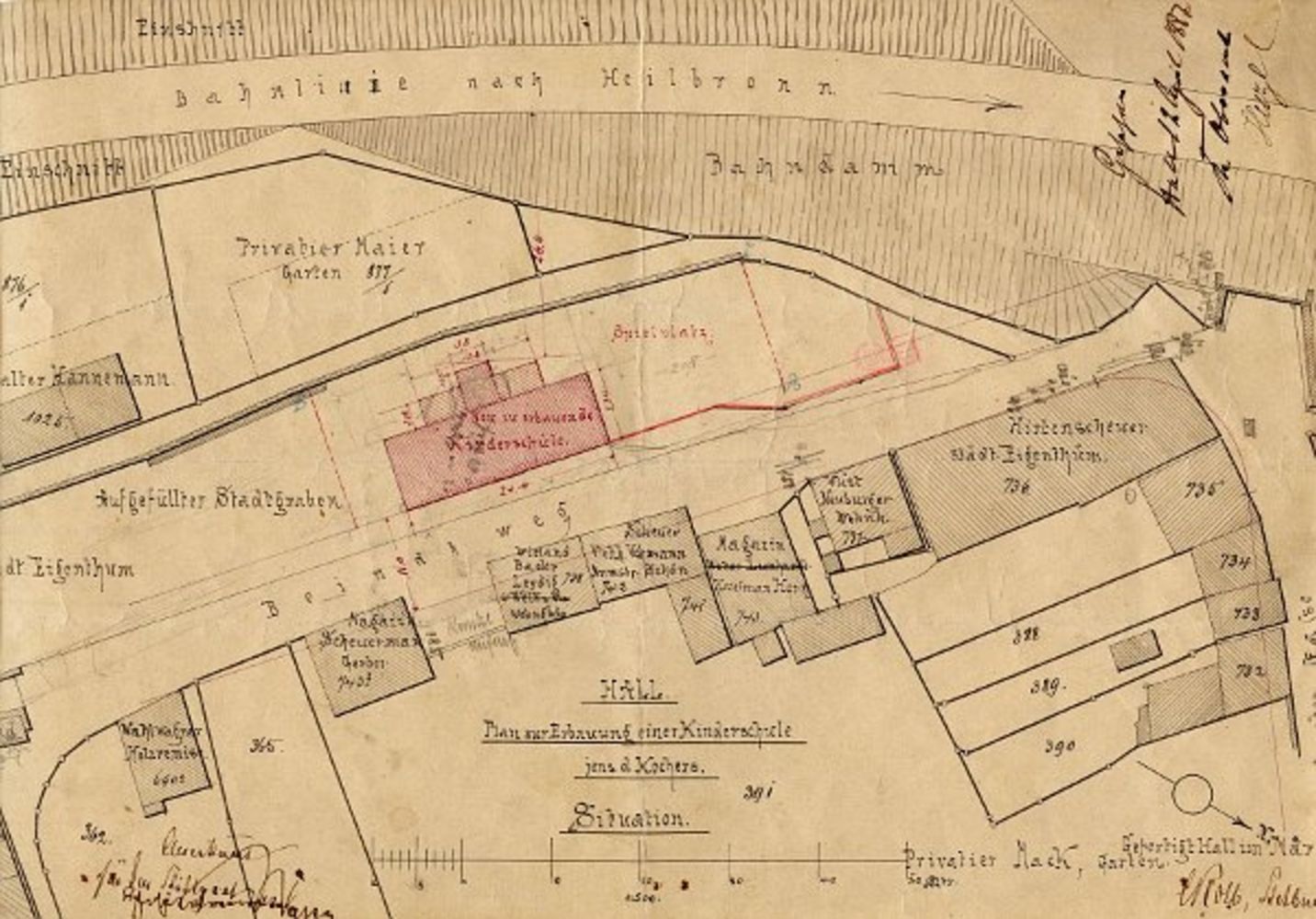 1887: Gemeinderat und Bürgerausschuss beraten am 25. Februar 1887 über "die Bitte um unendgeldliche Ueberlassung eines Theils des städtischen Platzes am Baindtweg an die Hospitalverwaltung zum Zweck der Erbauung eines Kleinkinderschulgebäudes für den Stadttheil jenseits Kochers." Man kommt zum folgenden Beschluss: "...in Anbetracht, daß die Hospitalverwaltung durch die Erbauung der zum dringenden Bedürfniß gewordenen Kleinkinderschule, wie durch Uebernahme derselben der verpflichteten Stadtgemeinde eine bedeutende Last abgenommen hat, ferner daß die Stadtgemeinde durch die Abtretung fraglichen Platzes, der als aufgefüllter Stadtgraben zu den minderwerthigen gehört, einen nennenswerthen Ausfall an Pachtgeld nicht erleidet, um so weniger als die Unterhaltung der angrenzenden Stadtmauer fortwährend, insbesondere aber in diesem Frühjahr einen nicht unbedeutenden Aufwand erfordert, zugleich im Interesse des baldigen Zustandekommens des Bauwesens von beiden Kollegien je einstimmig beschlossen: