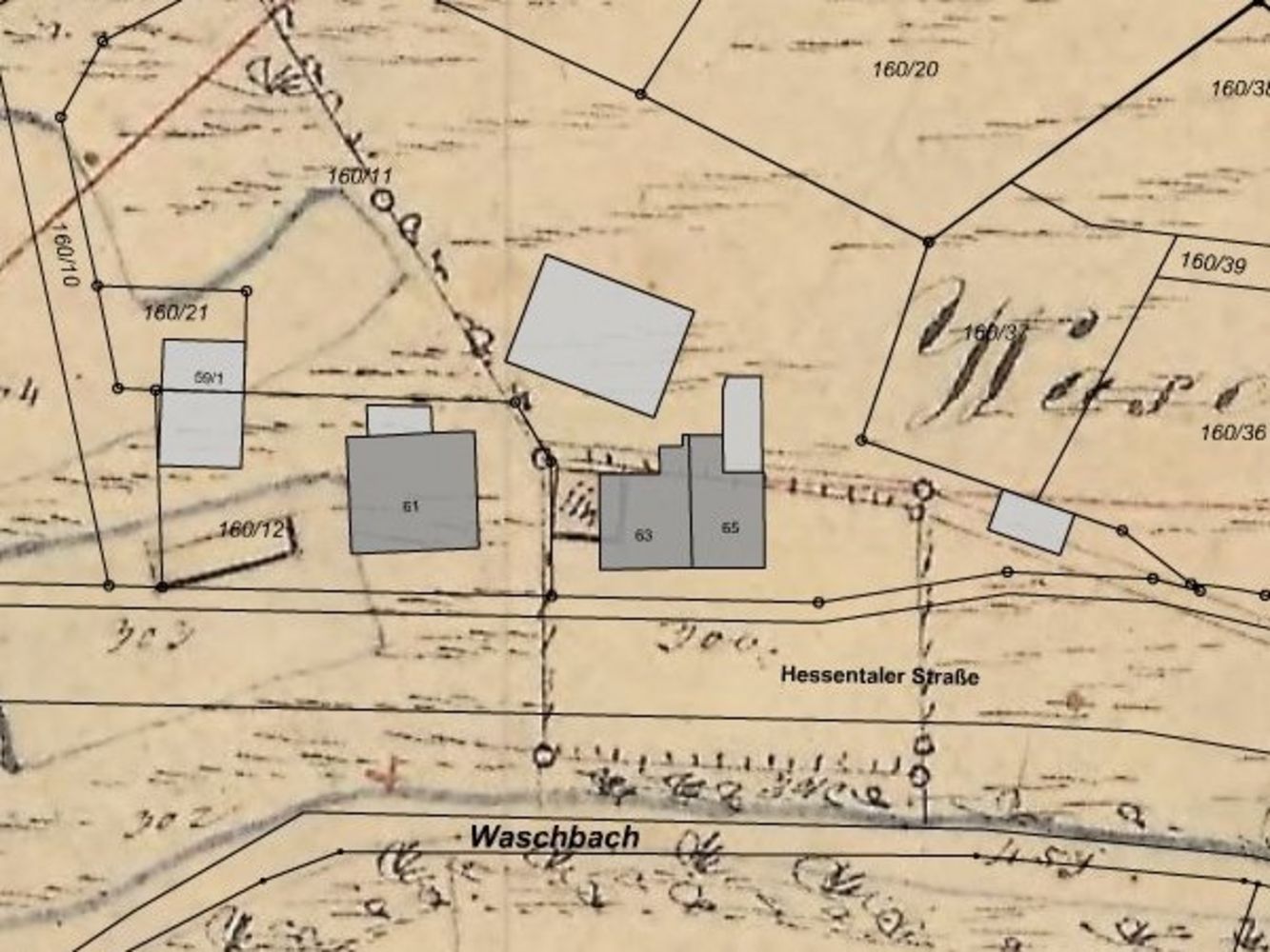 1830 (Primärkataster): die sogenannte Waschwiese, Wohnhaus mit 3,7 Ruthen, Hofraum mit 29,9 Ruthen